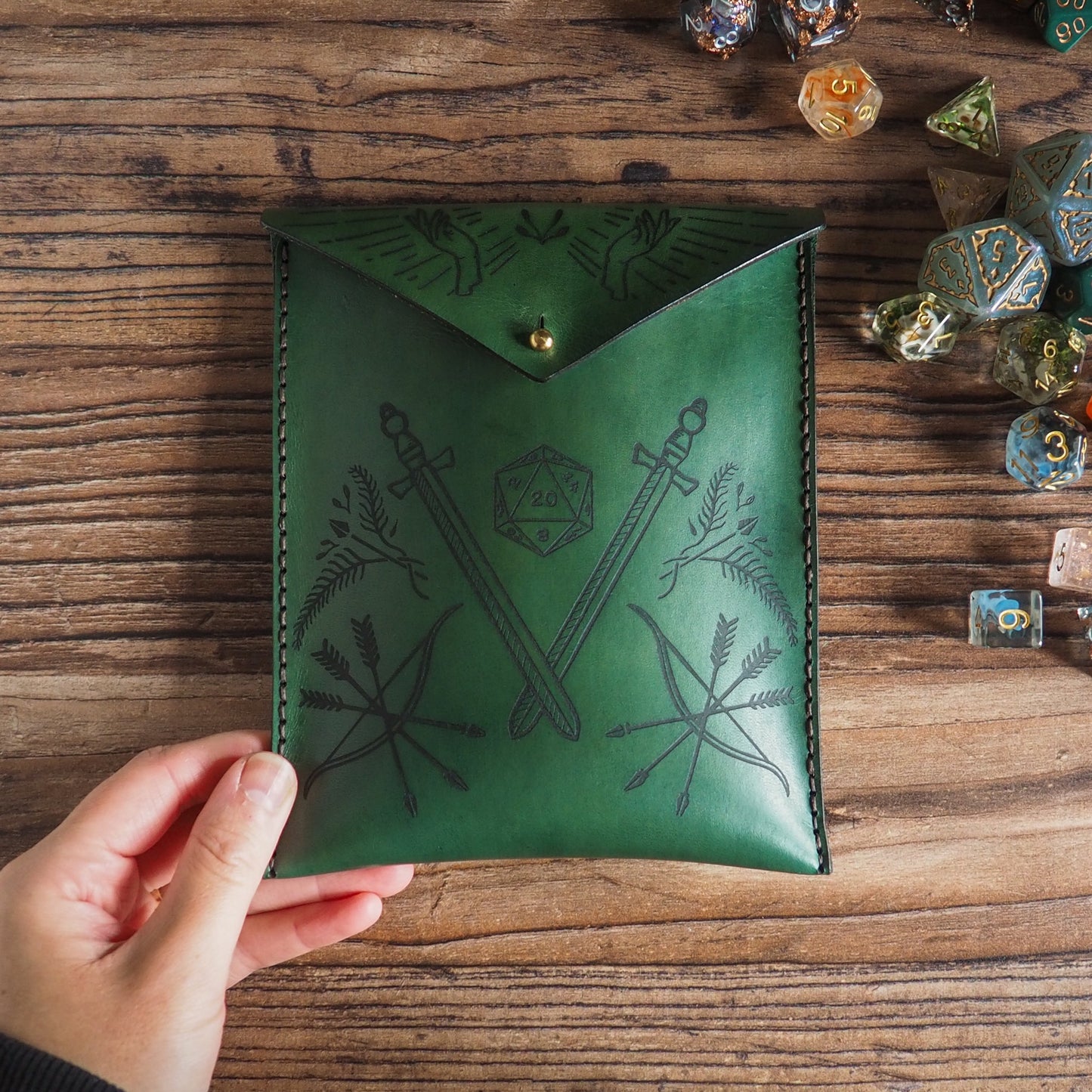 Ready for game night, this leather dice bag is just the thing to keep your dice hoard safe. Decorated with engravings of all the essentials a young adventurer could want, it’s made from vibrant hand-dyed leather, hand-stitched in your favourite colours, and secured with a trusty brass stud.
