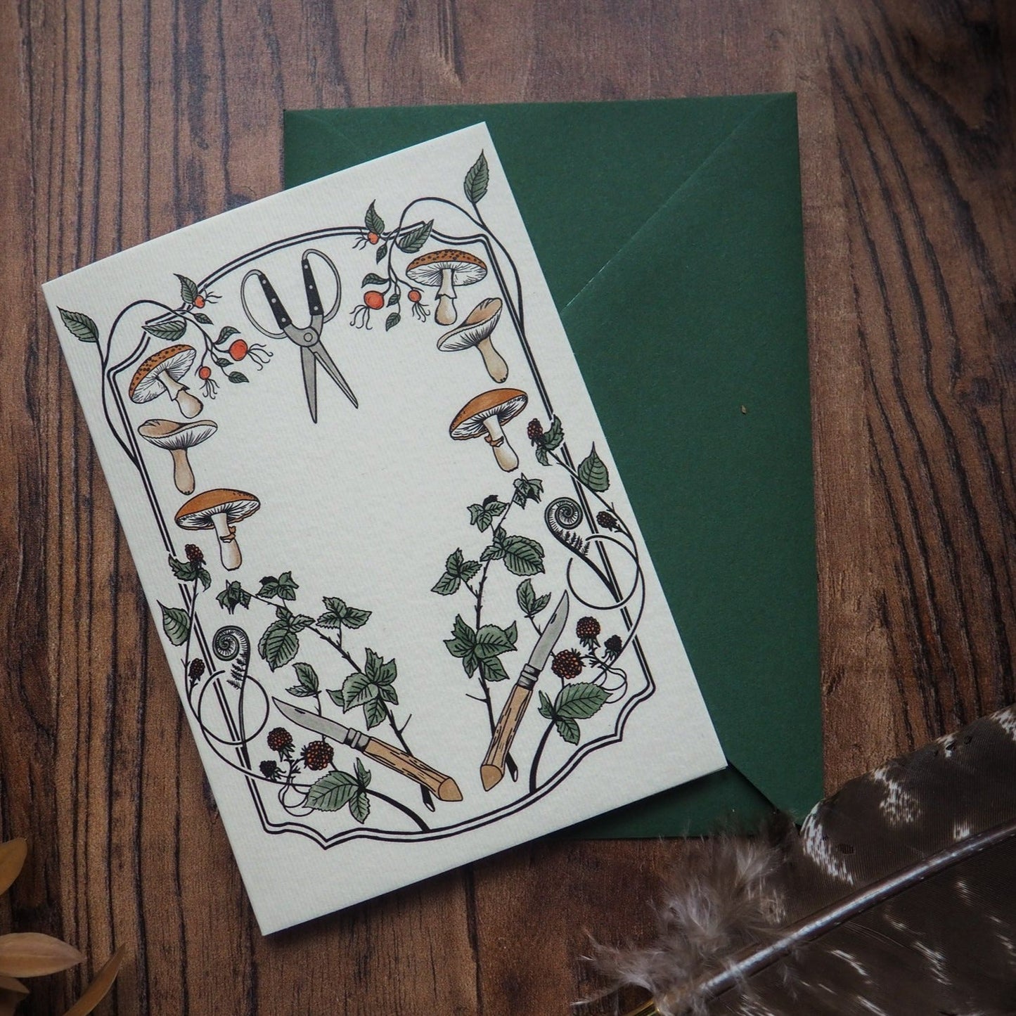 Celebrate your love for gardening, foraging, and blackberry picking with our Forager Greeting Card. Featuring a charming illustration of pruning shears, mushrooms, blackberries, and rosehips, this floral cottage-core card is perfect for nature lovers.