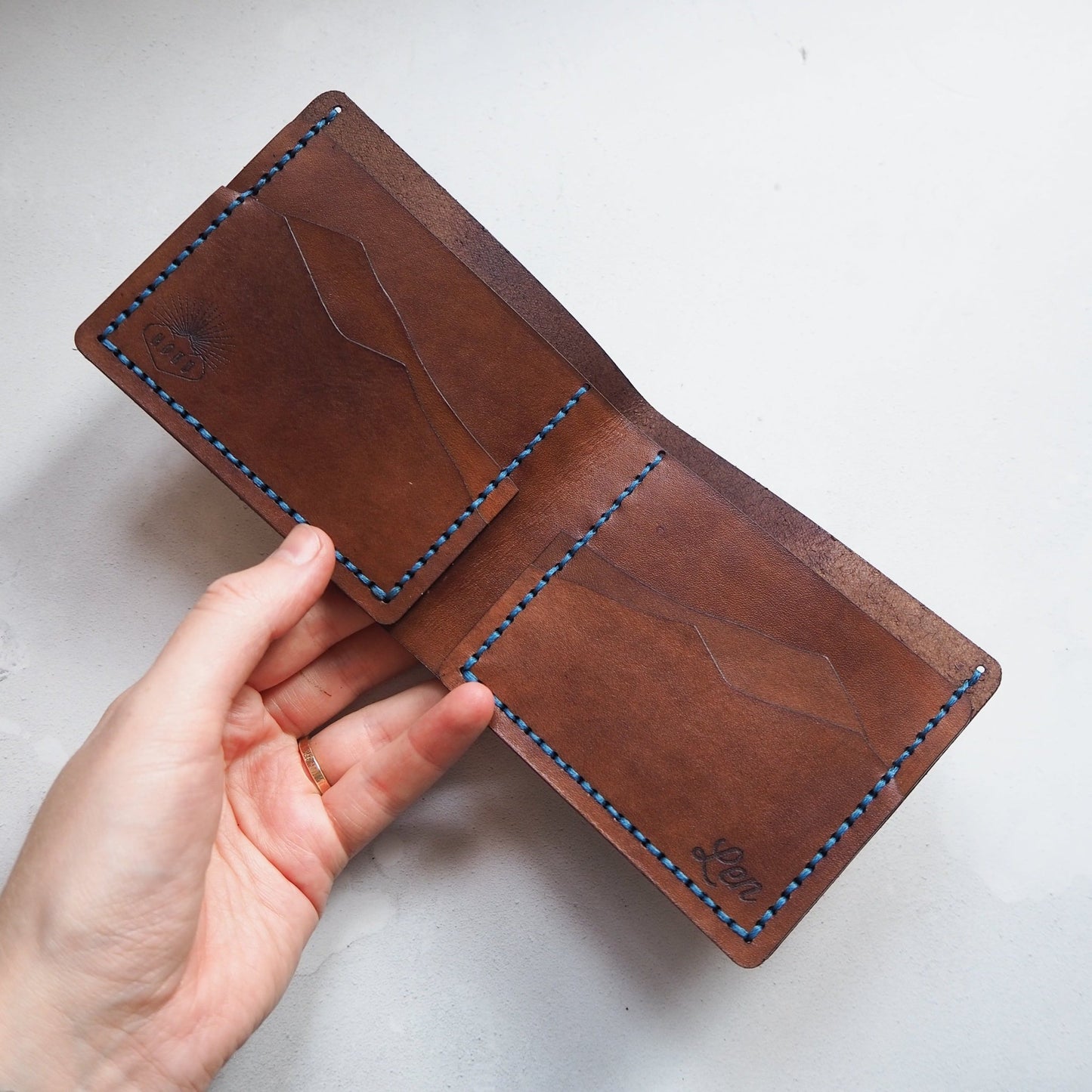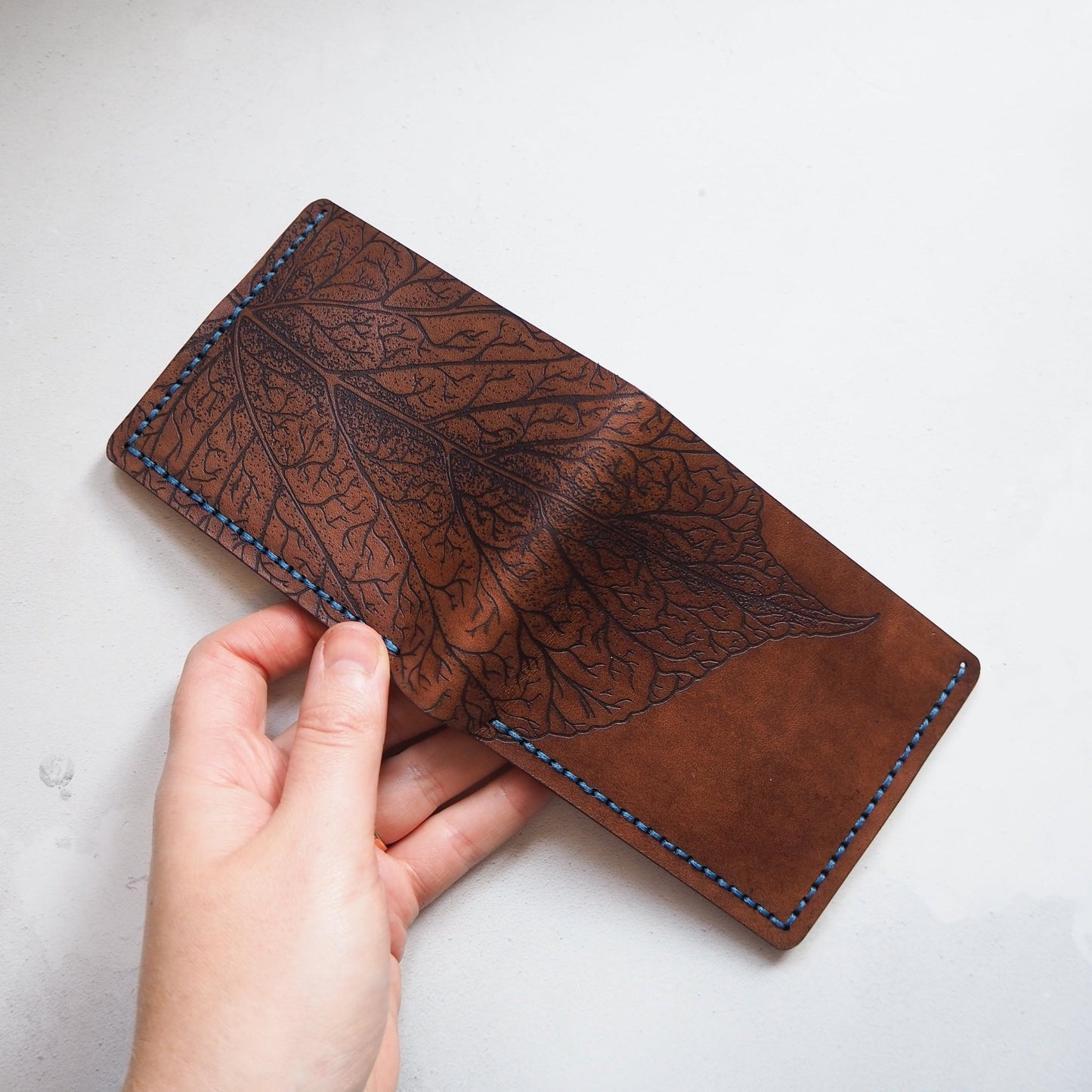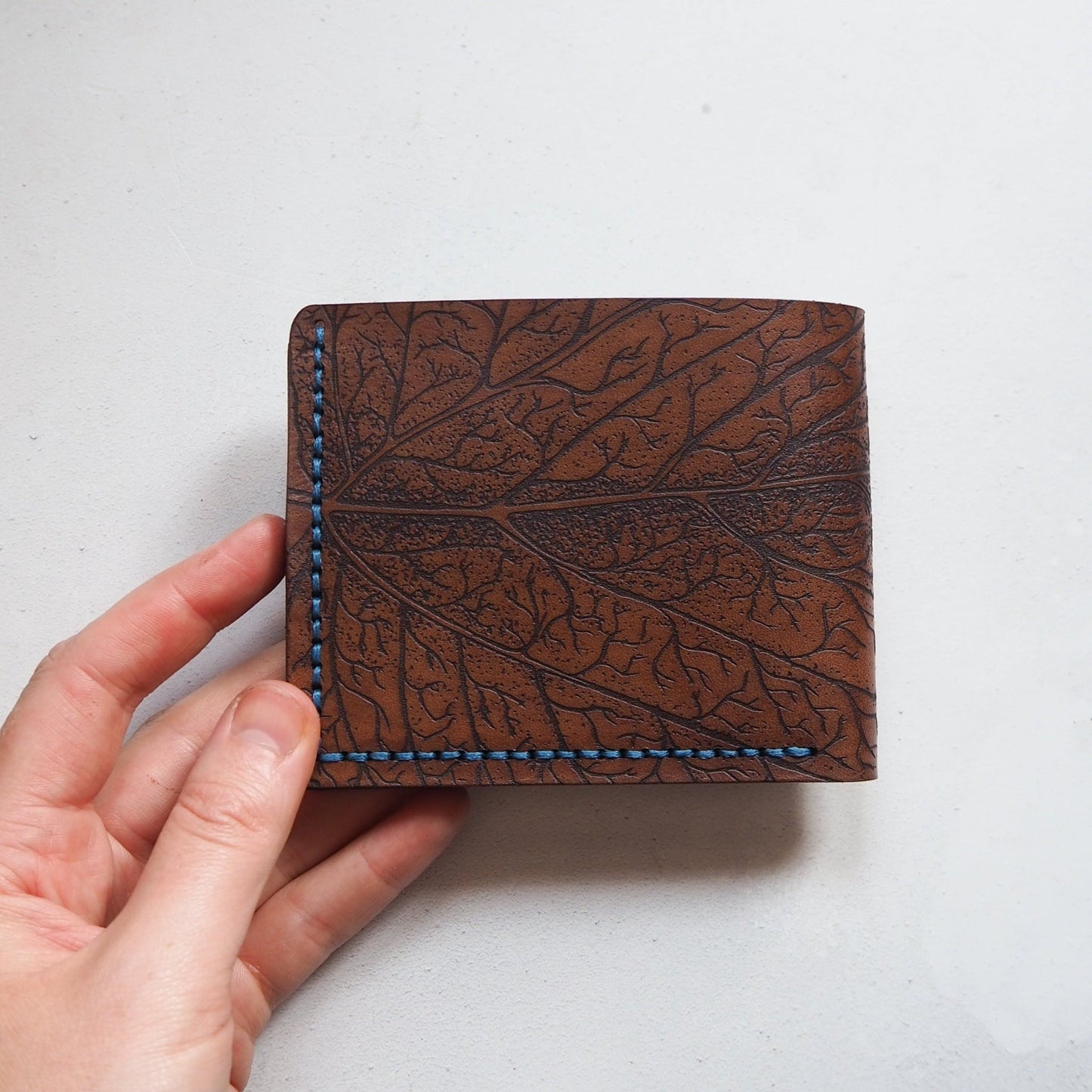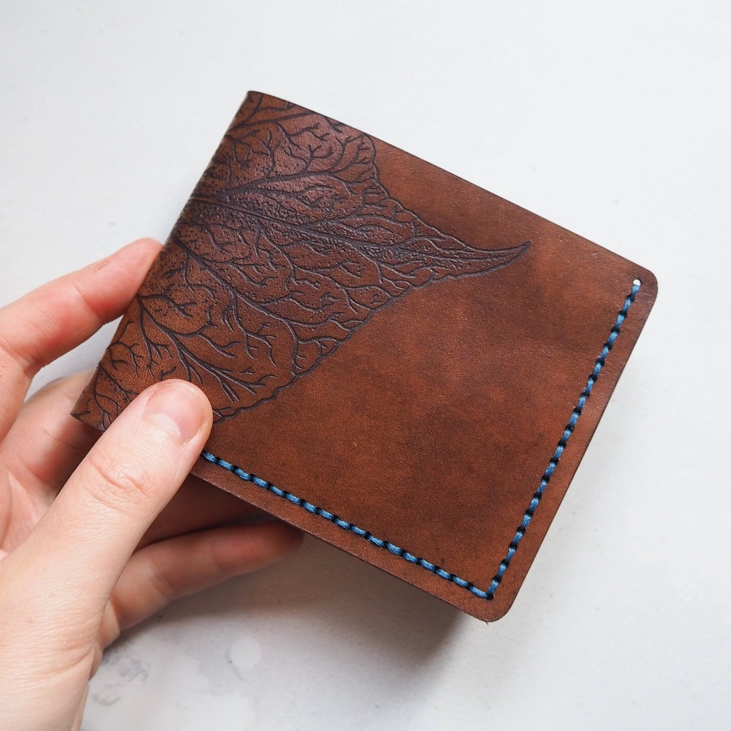 - Your choice of leather and stitch colour - the example is dyed in Medium Brown and stitched in Blue thread.