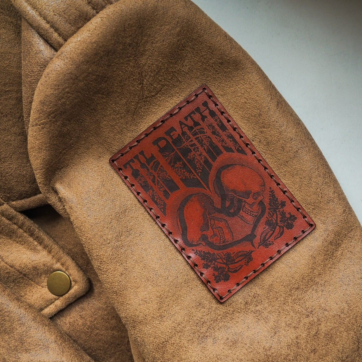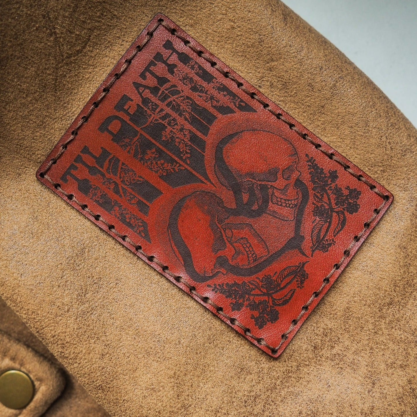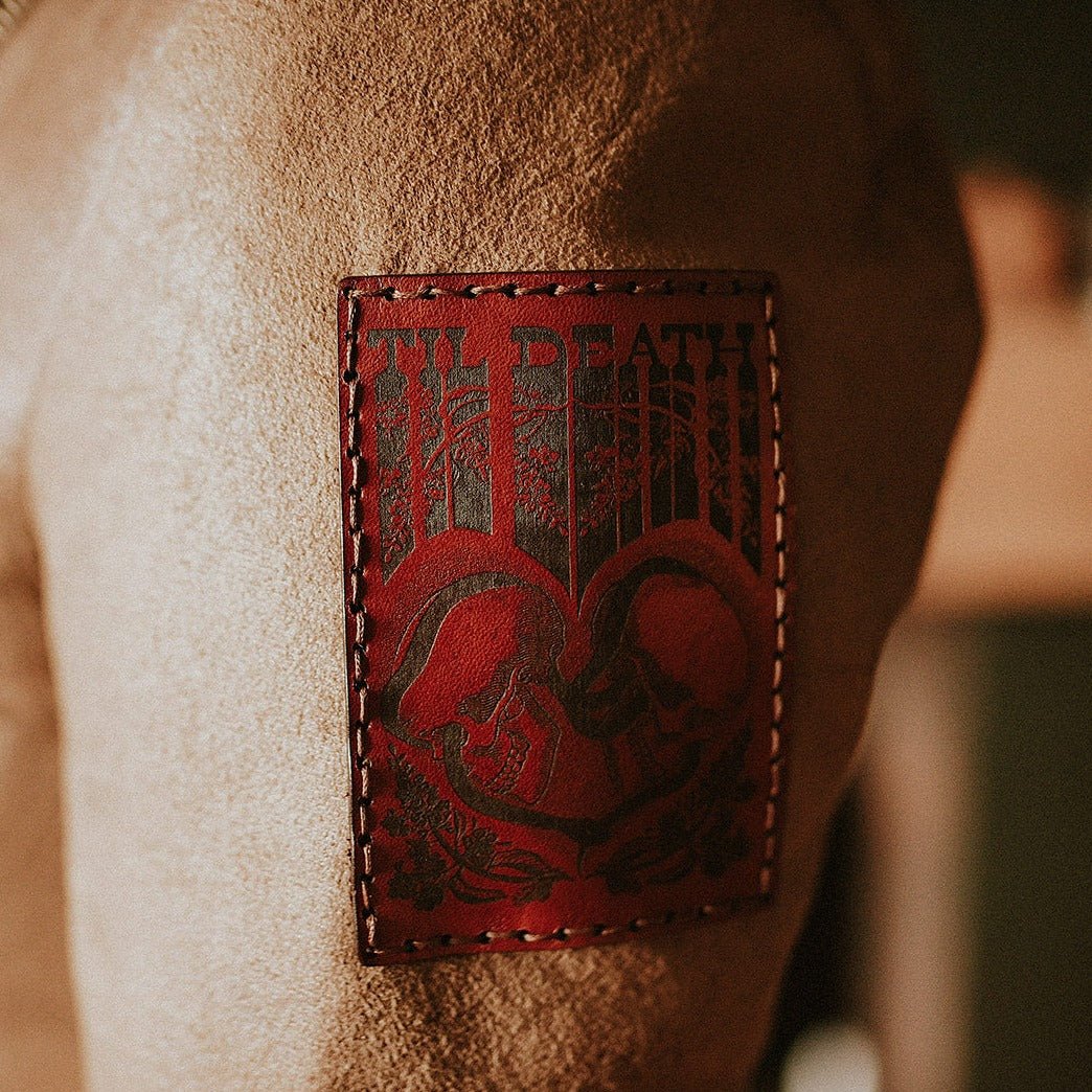 This leather patch is the perfect way to add something extra to your outfit. Our Til Death design combines two twin skulls entwined by a snake, balanced by the psychedelic styling of Myrtle and the powerful words "Til Death". Spice up your wedding looks with some rocking, psychedelic vibes!