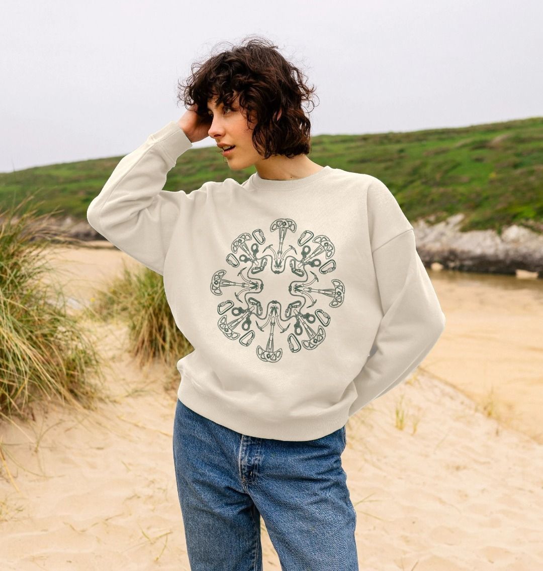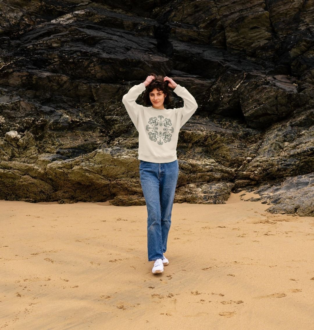 Certified Organic Cotton Relaxed Fit Sweatshirt, 300g/m2. Wash cool, hang dry. GM free. Not tested on animals. Does not contain animal-derived products. Printed in the UK with low waste printing tech. Made in a renewable energy powered factory audited for a wide range of social and sustainability criteria.