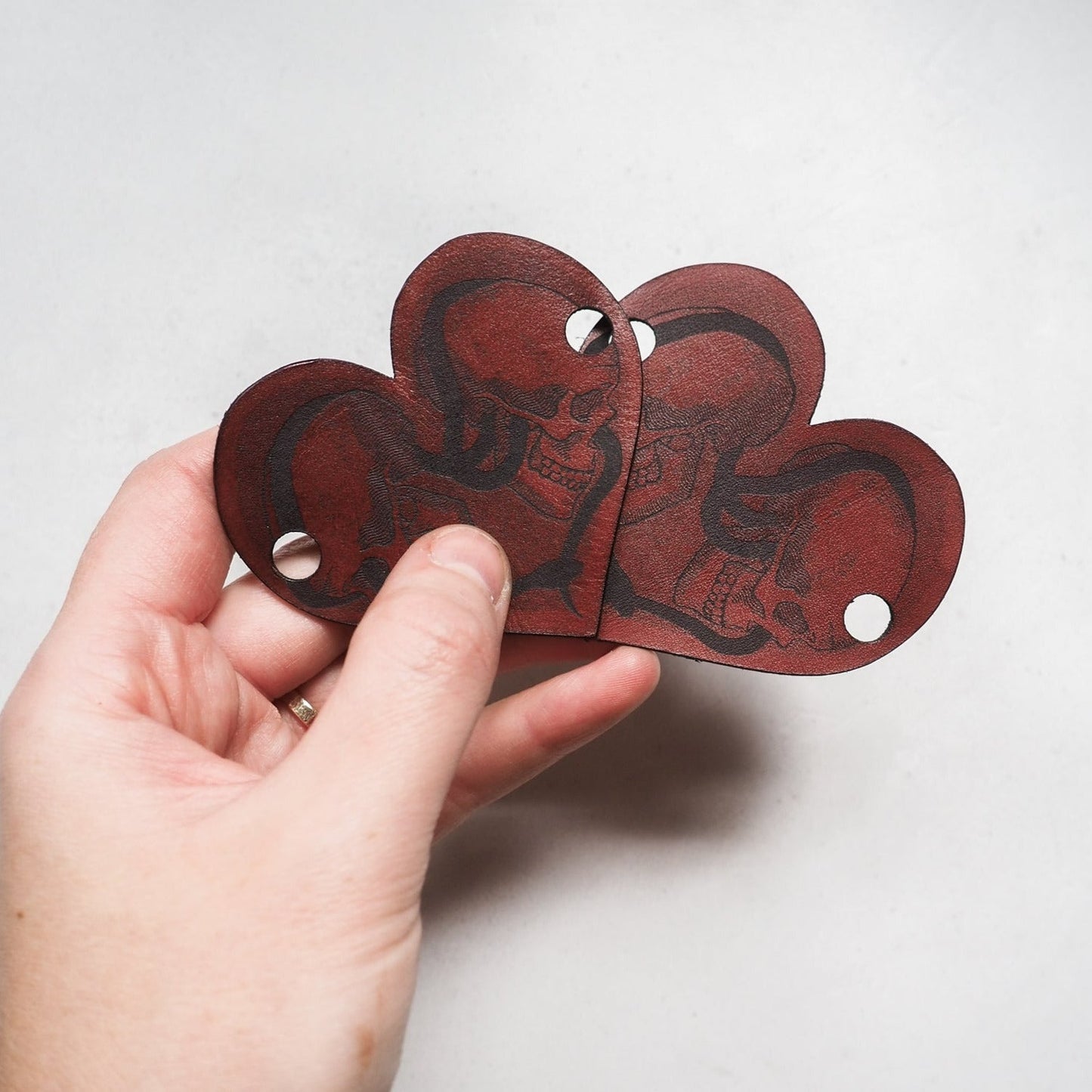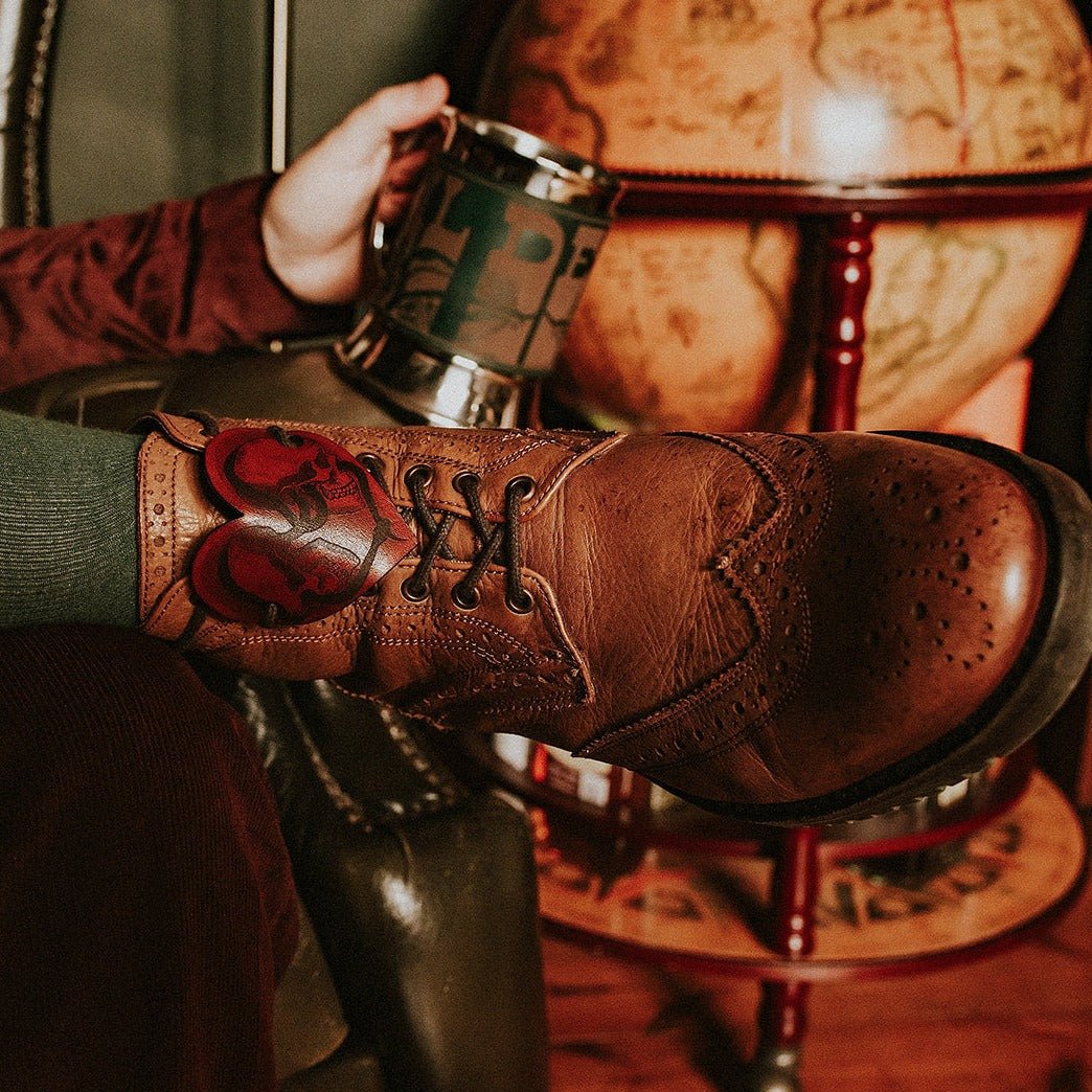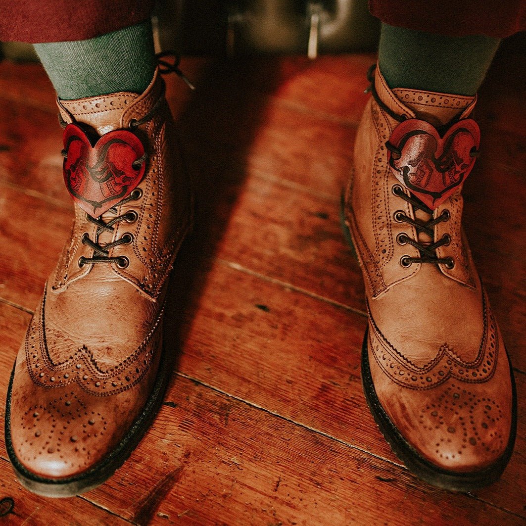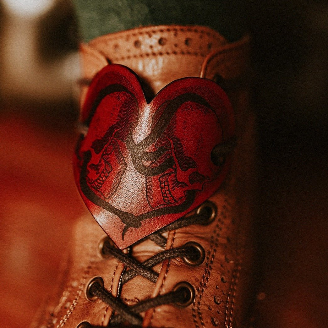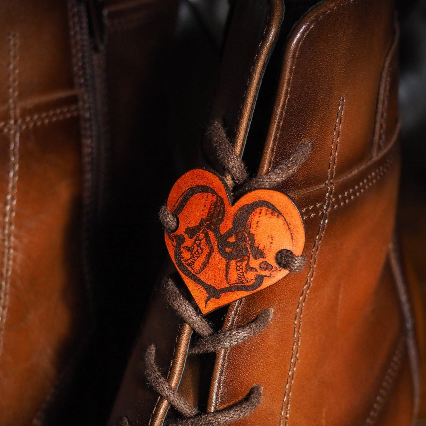 Add intrigue to your shoe laces with our hand-dyed, full-grain leather shoe charms. Engraved with our Love entwined illustration which features two skulls joined by a snake, these shoe charms sit comfortably on your laces. These come as a pair, you will receive two shoe charms, one for each shoe.