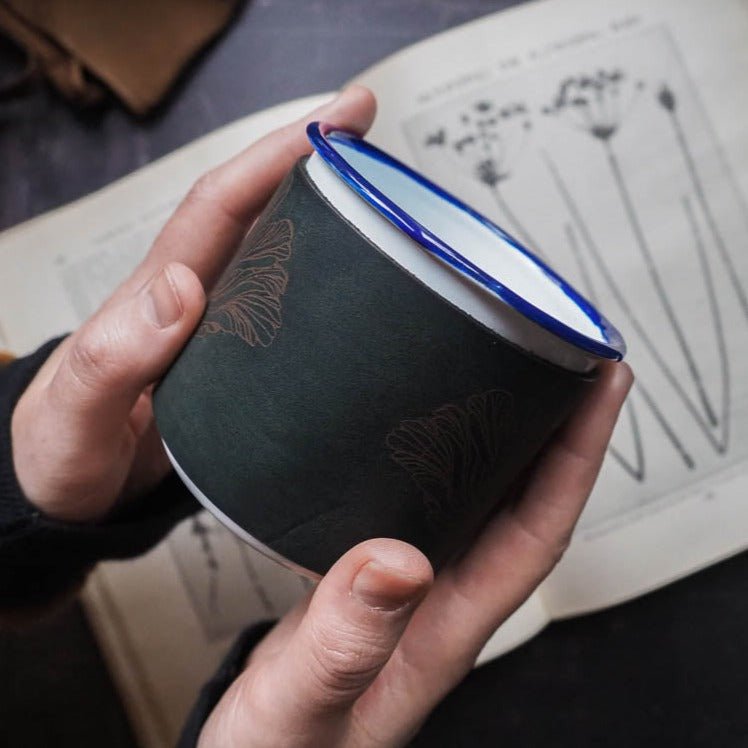 The Mushroom Mug - Enamel with Leather Wrap - REPOSE : Studies in Nature