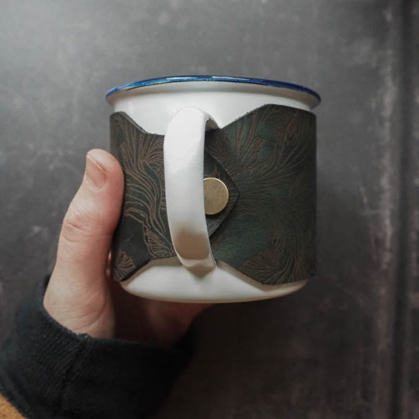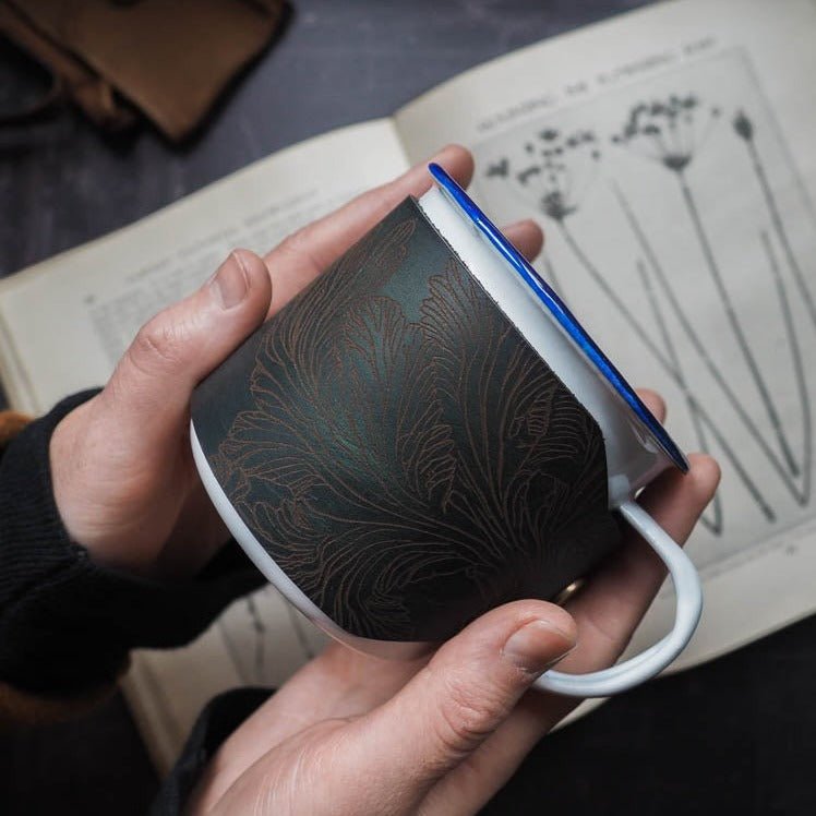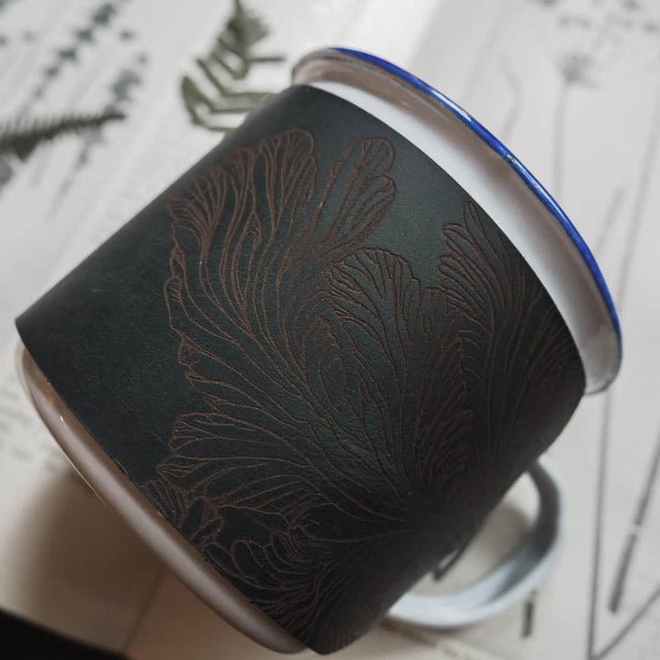 Introducing our Mushroom Enamel Mug with Leather Wrap, featuring intricate mushroom gill patterns engraved on a removable leather wrap. The enamel mug is perfect for outdoor use, while the leather wrap provides a comfortable grip and protects your hands from the temperature of the mug. Available in a variety of colours, this mug is essential for your camping trips, picnics, or for enjoying your favourite hot beverages in the garden.