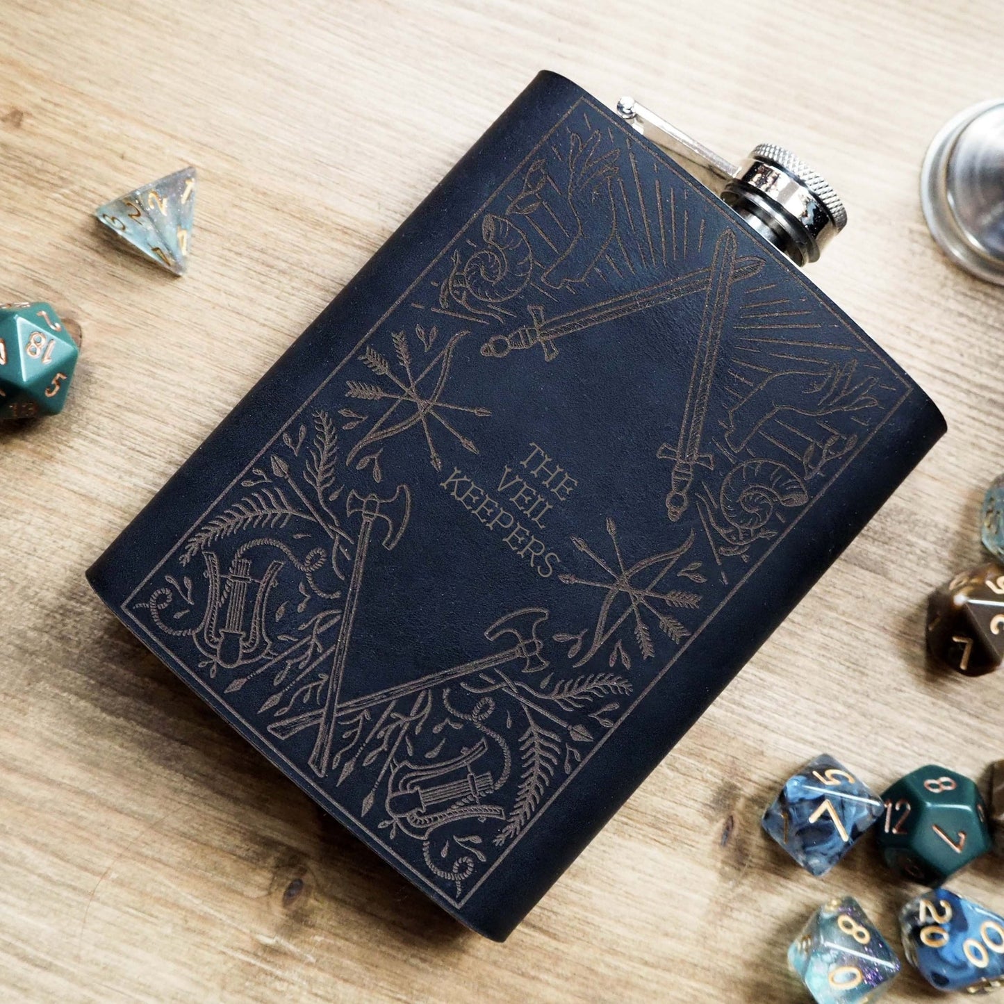 The Dungeoneers Hip Flask is fully engraved with our "Adventurers tome" design, made up of a variety of adventuring gear from a rangers bow to the bardic lyre, healing hands and hempen rope. This dungeons and dragons flask can be personalised with your choice of text in the centre and is 8 fluid ounces in size (8 good sized shots/drams)