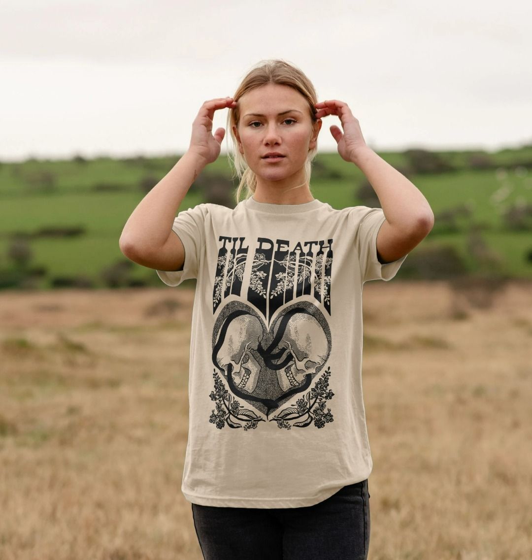 In dark & daring print, this Til Death t-shirt looks slick & bold! Our twin skulls entwined with a snake and the text "Til Death" make for some bold psychedelia - stylishly sick!