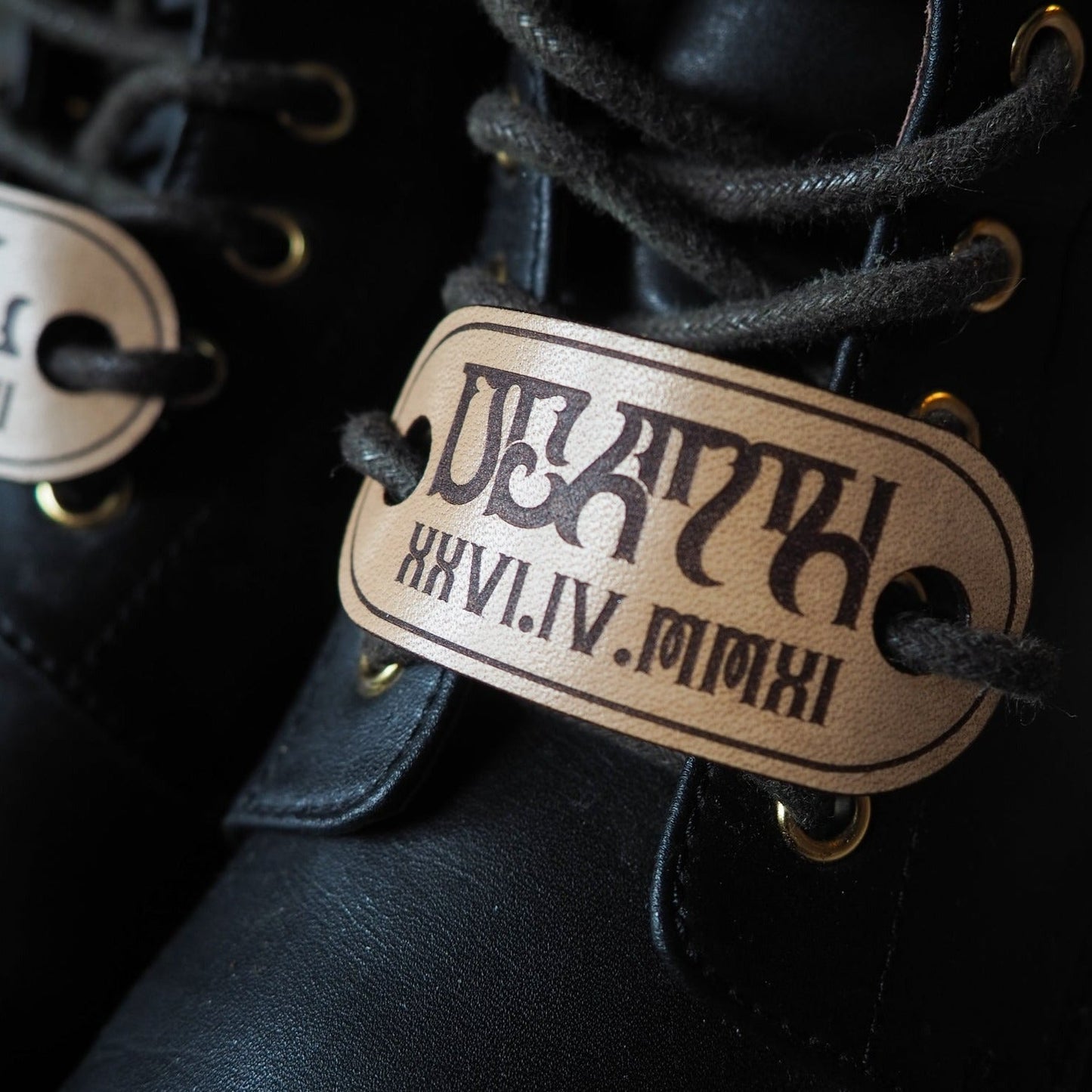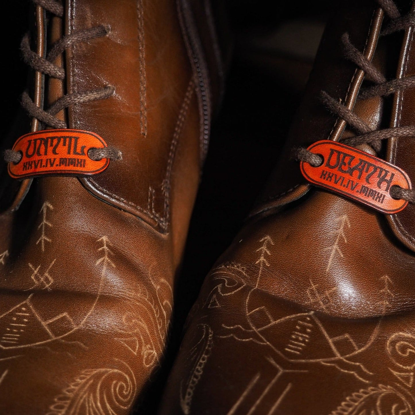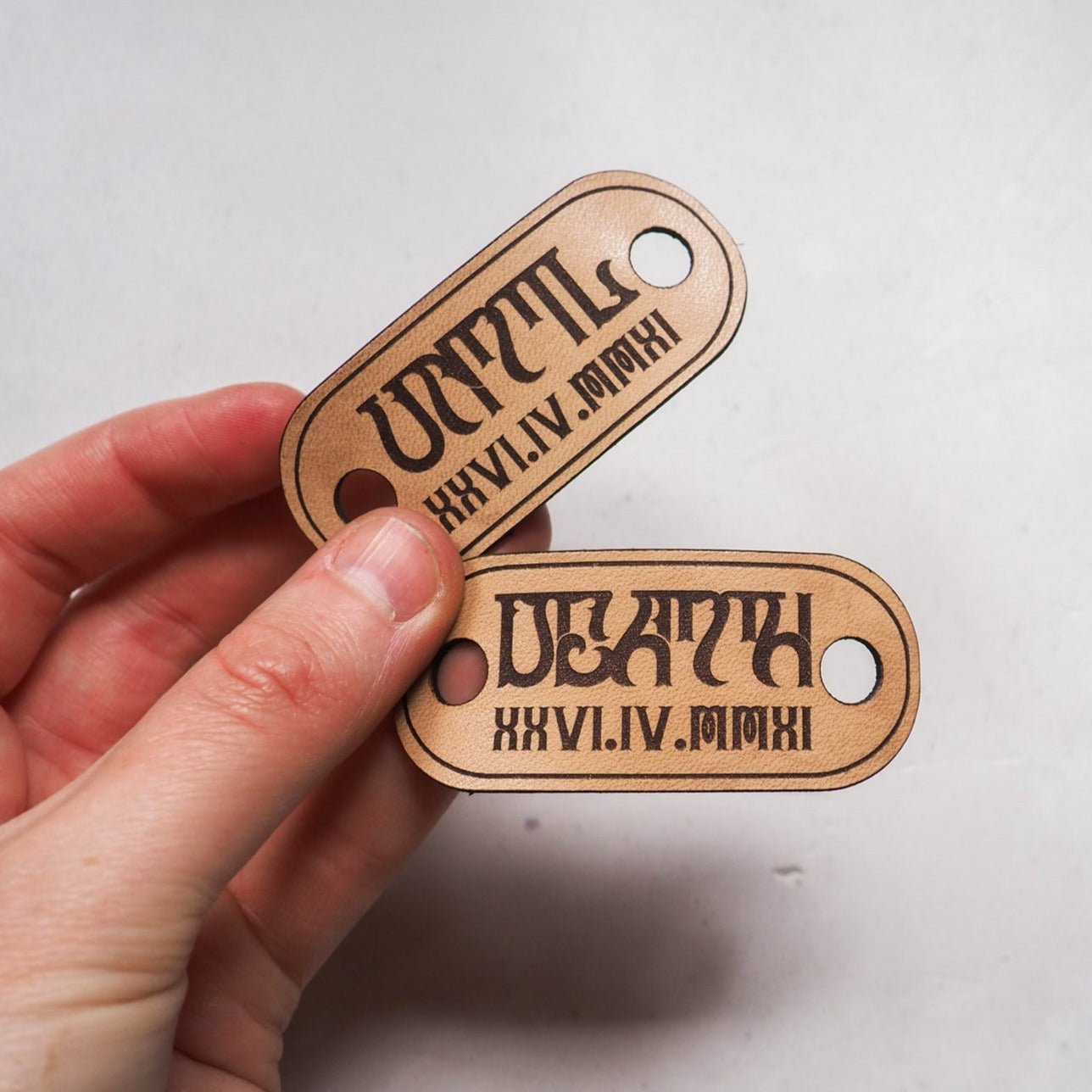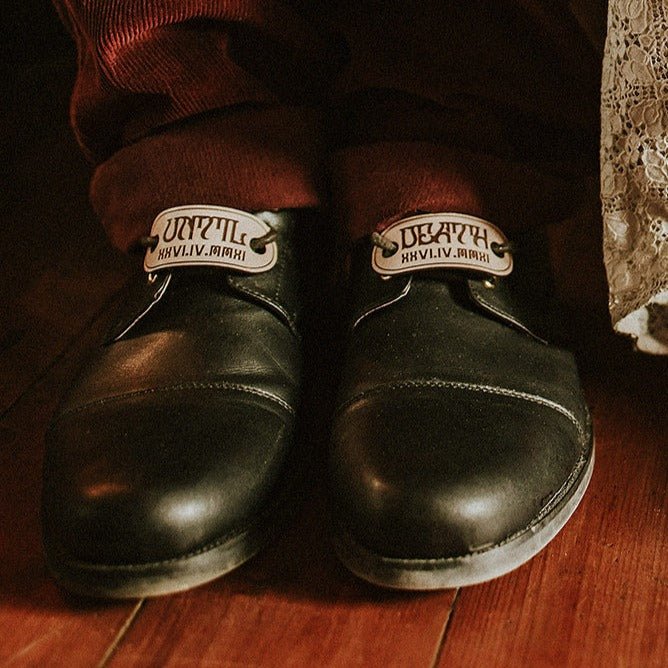 Add intrigue to your shoe laces with our hand-dyed, full-grain leather shoe charms. Engraved with the phrase "Until Death" and embellished with your wedding date, these shoe charms make for an awesome decoration to add to your shoes. These come as a pair, you will receive two shoe charms, one for each shoe. One charm is engraved with "Until" and your wedding date, and the other is engraved with "Death" and also your wedding date.