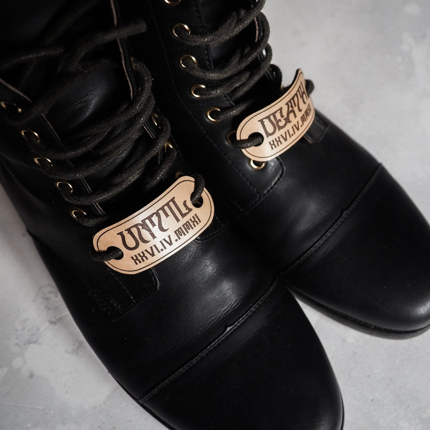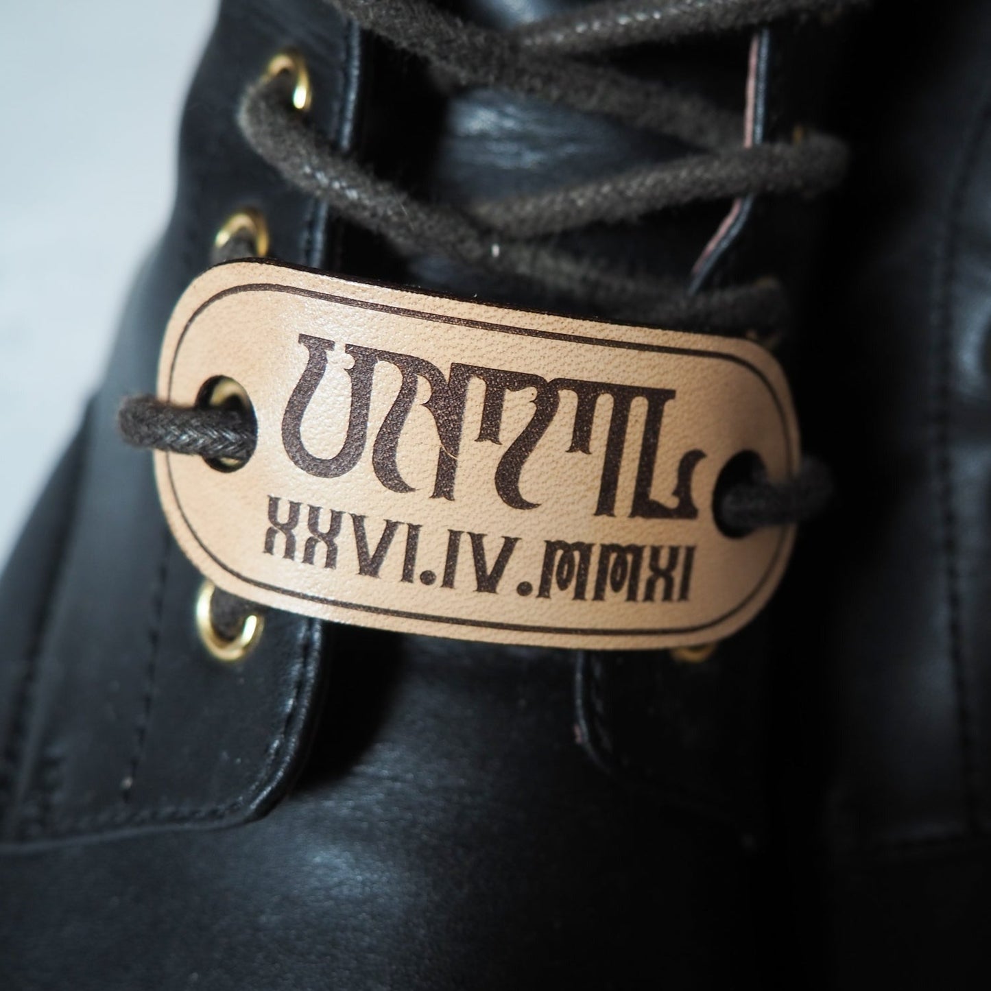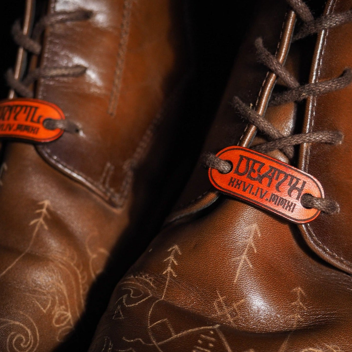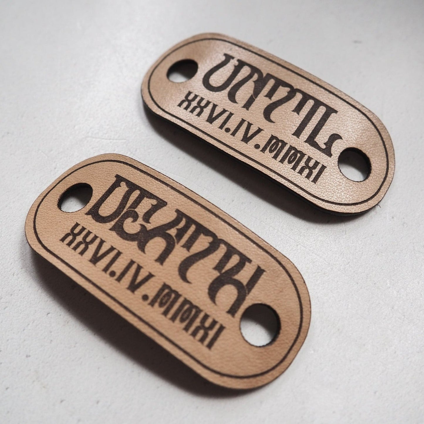Add intrigue to your shoe laces with our hand-dyed, full-grain leather shoe charms. Engraved with the phrase "Until Death" and embellished with your wedding date, these shoe charms make for an awesome decoration to add to your shoes. These come as a pair, you will receive two shoe charms, one for each shoe. One charm is engraved with "Until" and your wedding date, and the other is engraved with "Death" and also your wedding date.